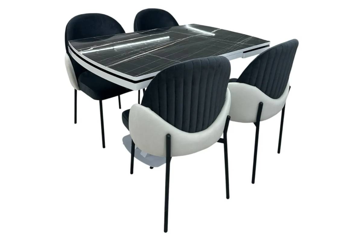 CaracteristicSetul de dining Belgrad este soluția ideală pentru un interior modern și sofisticat. Masa extensibilă (80x120/150/180 cm) se remarcă prin blatul royal marble high gloss, cu un finisaj de marmură neagră lucioasă și nervuri contrastante, susținut de picioare albe elegante. Setul include 4 scaune Ada Luna (V20/V01), tapițate cu catifea (velur) moale în două culori (alb și negru), oferind un confort sporit și un design ergonomic. Picioarele metalice negre ale scaunelor asigură stabilitate și un aspect minimalist, fiind perfecte pentru bucătării moderne sau zone de livingi