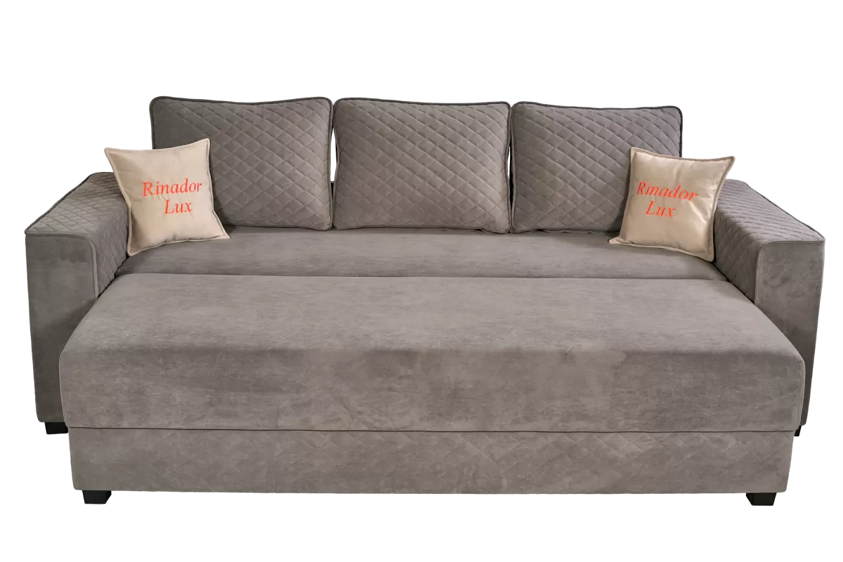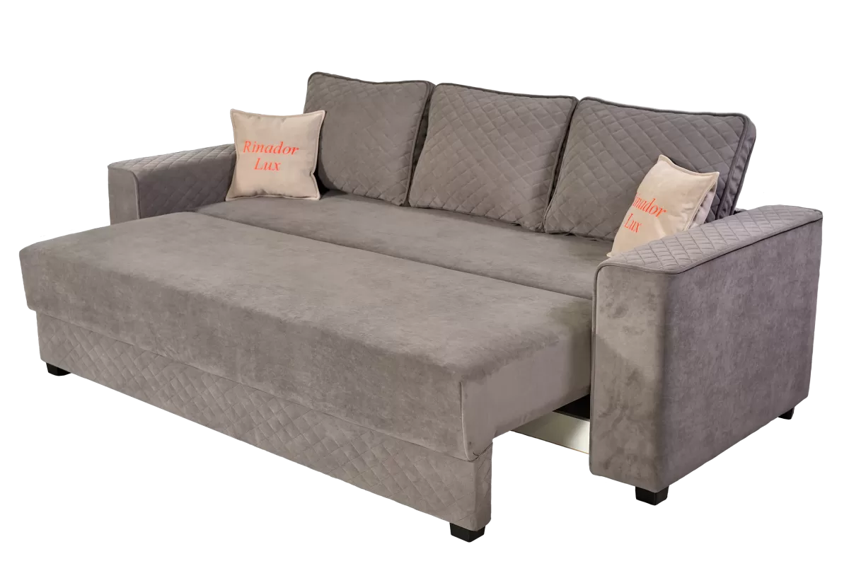 Tapițeria matlasată oferă un plus de rafinament, iar mecanismul de extensie transformă rapid canapeaua într-un spațiu confortabil de dormit.