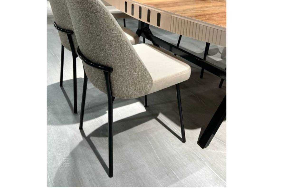 Setul de dining Cemre emană o eleganță naturală și un stil scandinav rafinat. Masa extensibilă se remarcă prin blatul cu textură de lemn cald și un design unic al bazei, având picioare metalice negre în formă de X pentru stabilitate maximă. Cele 6 scaune sunt tapițate cu o țesătură texturată (tip bucle sau stofă premium) în nuanță bej-crem, oferind un confort ergonomic excelent. Detaliul metalic negru de pe spătarul scaunelor se armonizează perfect cu structura mesei, creând un ansamblu vizual coerent, ideal pentru zone de living sau bucătării moderne și primitoare.