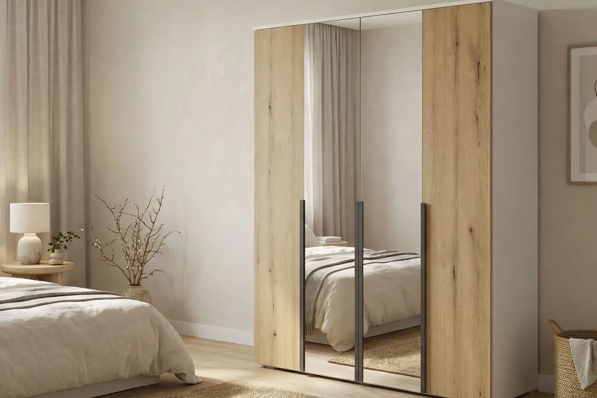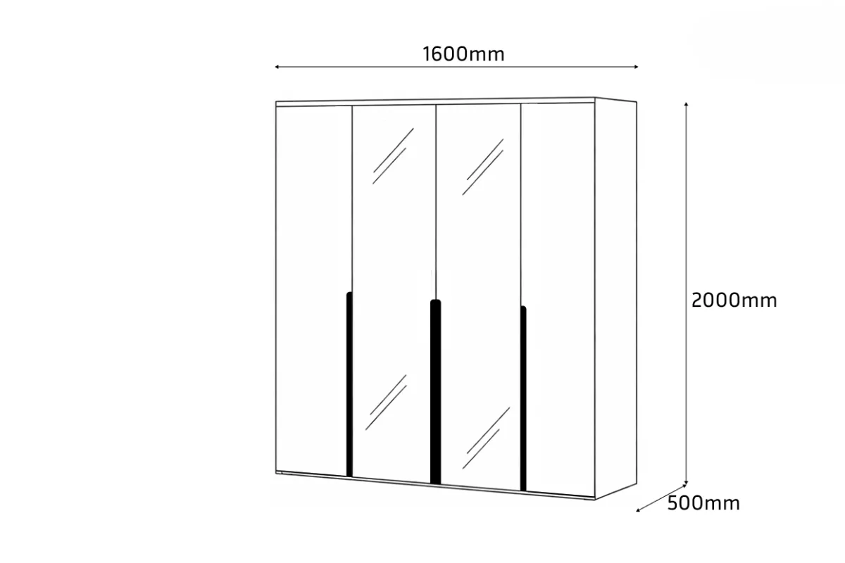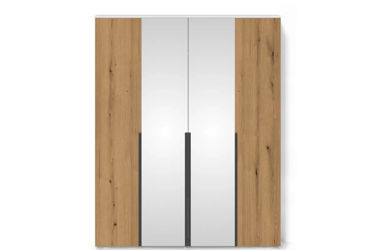 Шкаф Linia 1600 впечатляет современным дизайном, гармонично сочетая безупречный белый цвет корпуса с теплой текстурой дуба Эвок. Два высоких зеркала в пол визуально увеличивают пространство комнаты, а продуманная четырехдверная конструкция обеспечивает вместительное и организованное хранение вашего гардероба.