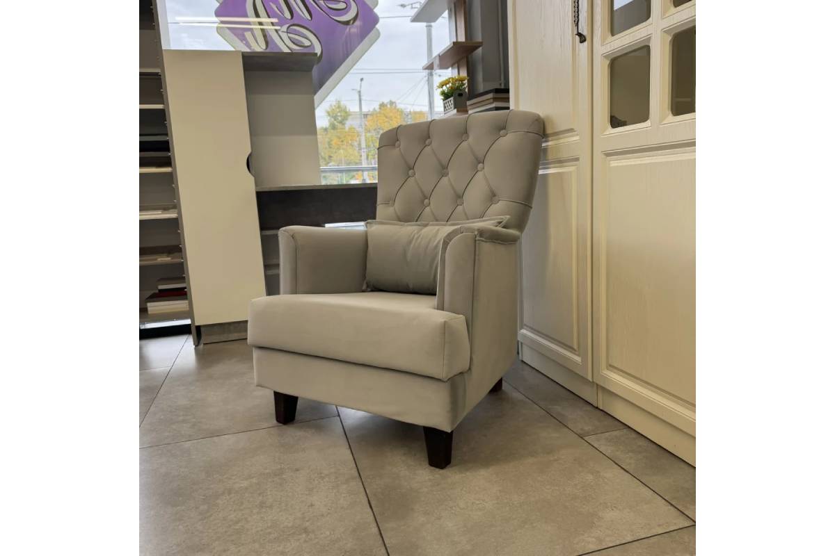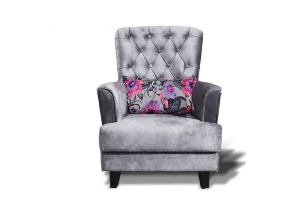 Fotoliul Iris K-1 este o piesă elegantă ce îmbină stilul clasic cu cel modern. Spătarul înalt, decorat cu nasturi în stil „Capitonne”, oferă o susținere excelentă și un aspect rafinat. Tapițeria din velur gri, plăcută la atingere, este completată de o pernă decorativă cu imprimeu floral vibrant, aducând un plus de stil oricărui living sau dormitor.