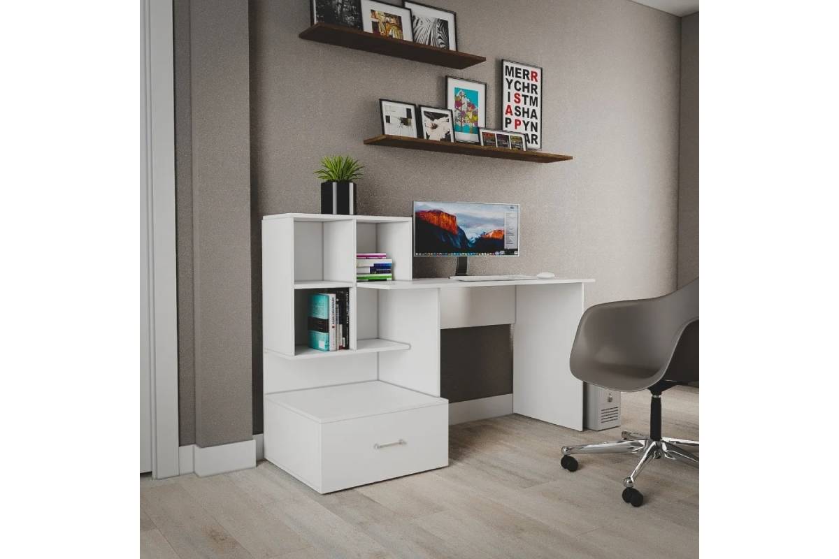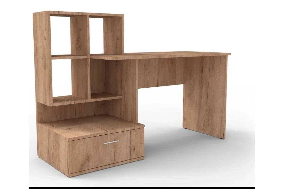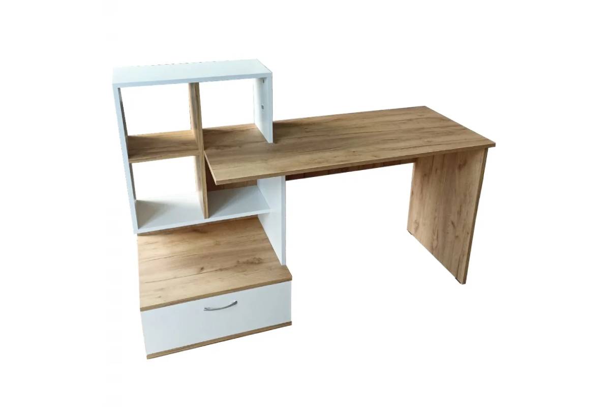 Masa de scris ML-10 (1500) redefinește spațiul de lucru prin designul său asimetric și multifuncțional. Blatul generos de 150 cm este îmbinat armonios cu un sistem de rafturi etajate, oferind numeroase nișe deschise pentru organizarea cărților și a obiectelor decorative. Partea inferioară dispune de o tumbă cu un sertar încăpător, ideal pentru rechizite. Contrastul dintre nuanța caldă a lemnului și albul imaculat oferă un aspect modern și aerisit. Versatilitatea modelului permite montarea pe partea stângă sau dreaptă, adaptându-se perfect oricărui colț al camerei.