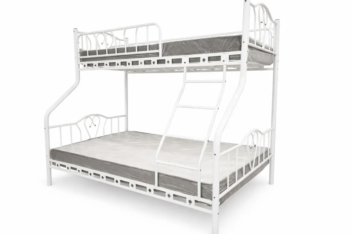 Acest pat cu două nivele Orkide Triple este soluția ideală pentru camerele cu spațiu limitat, oferind confort și funcționalitate pentru două persoane. Structura robustă din metal vopsit alb asigură durabilitate și stabilitate pe termen lung. Patul inferior este mai lat, oferind un spațiu generos de dormit, iar patul superior este perfect pentru o persoană, accesibil printr-o scară laterală solidă.