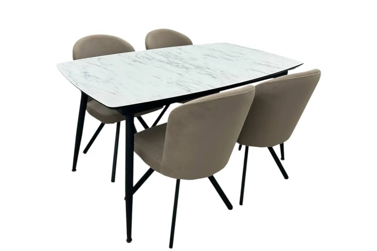 Setul de dining Yense impresionează prin designul său scandinav și materialele premium. Masa extensibilă (80x125/165 cm) dispune de un blat marmo super matt, care oferă aspectul nobil al marmurei albe fără reflexii lucioase, fiind foarte rezistent. Cele 4 scaune Barka (Anka 06) sunt tapițate cu un velur fin în nuanță bej-taupe, oferind un confort ergonomic excepțional. Picioarele metalice negre ale întregului set asigură stabilitate și un contrast vizual modern, fiind ideal pentru bucătării sau livinguri contemporane.